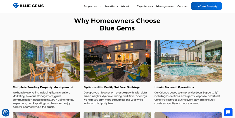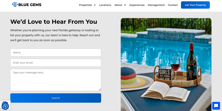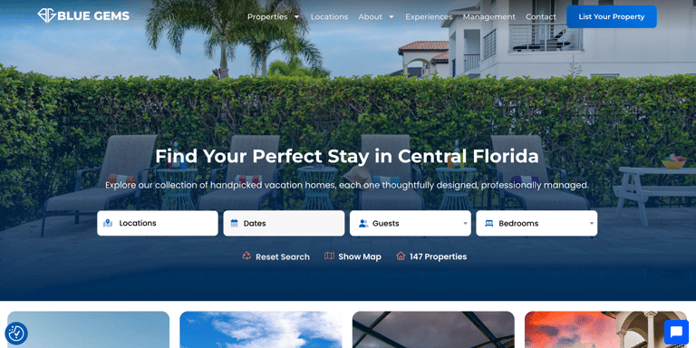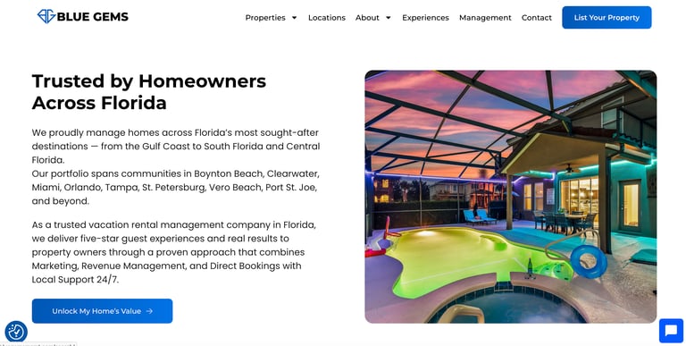 A short-term rental management company based in Florida had a heavy reliance on OTAs, with most bookings coming from Airbnb and Booking.com, and managed all listings through Guesty (Duda builder). The goal was to optimize their existing website to support direct bookings, improve search visibility, and build a trustworthy digital presence that reflected the quality of their properties. The existing site functioned more as an informational page, and the aim was to transform it into a lead-generating, guest-friendly booking platform.